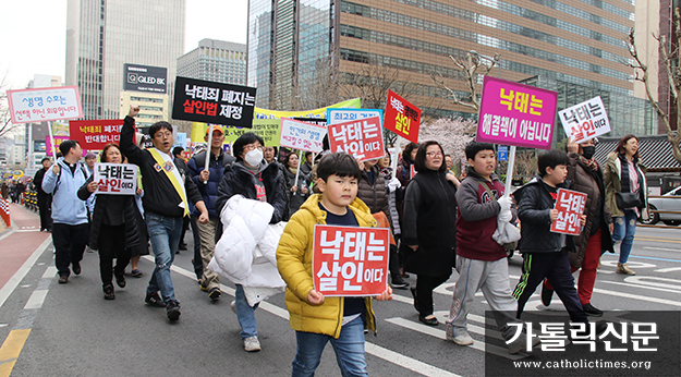 ‘2019 생명대행진 코리아’ 참가자들이 4월 6일 서울 종로 일대에서 “낙태는 살인이다, 태아도 생명이다”라고 외치며 행진하고 있다.