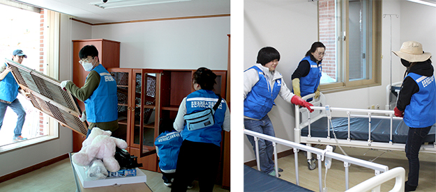 춘천교구 사회복지회 카리타스 자원봉사단, 운교동본당 청년회, 춘천시 장애인종합복지관 직원들이 4월 13일 강원도 고성 까리따스마태오요양원에서 피해 복구 지원 활동을 벌이고 있다. 춘천교구 사회복지회 제공