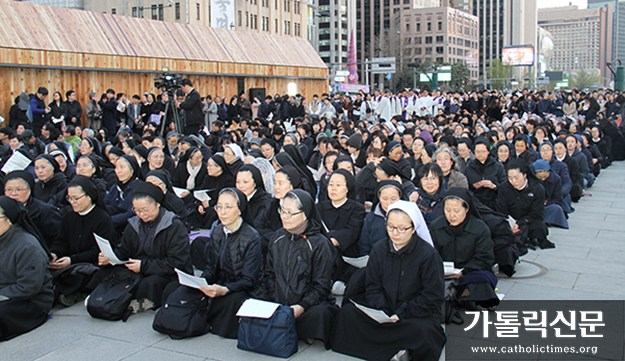 서울 광화문에서는 15일 오후 7시 서울대교구 사회사목국, 의정부교구 정의평화위원회, 한국남자수도회·사도생활단장상협의회, 한국천주교 여자수도회장상연합회, 정의평화가톨릭행동이 주관하는 미사가 봉헌됐다. 나승구 신부(서울대교구 빈민사목위원회 위원장) 주례로 봉헌된 이날 미사에는 사제단 110여 명과 수도자와 평신도, 시민 1100여 명이 함께했다.