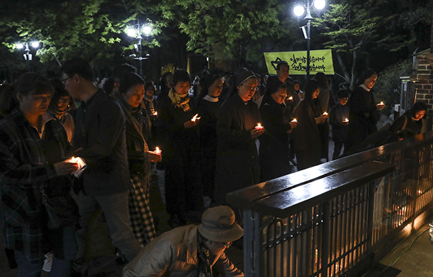 4월 16일 오후 8시 성모당에서 봉헌한 대구대교구 세월호 참사 5주기 추모미사에 참례한 신자들이 초를 봉헌하고 있다. 대구정평위 제공