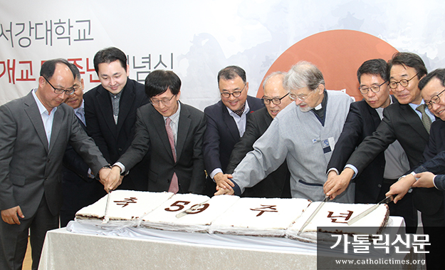 4월 18일 오전 11시 서강대학교 마태오관 리셉션홀에서 열린 개교 59주년 기념식에서 관계자들이 축하 떡을 자르고 있다.