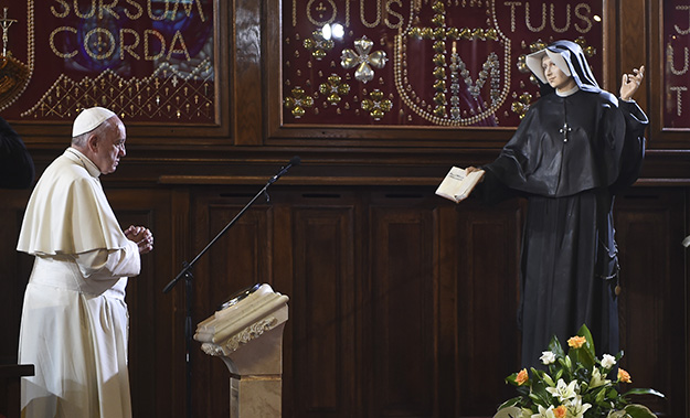 2016년 폴란드 세계청년대회 중 폴란드 크라쿠프 하느님 자비의 성당에서 기도하는 프란치스코 교황. 오른쪽으로 파우스티나 성녀상이 보인다. CNS 자료사진