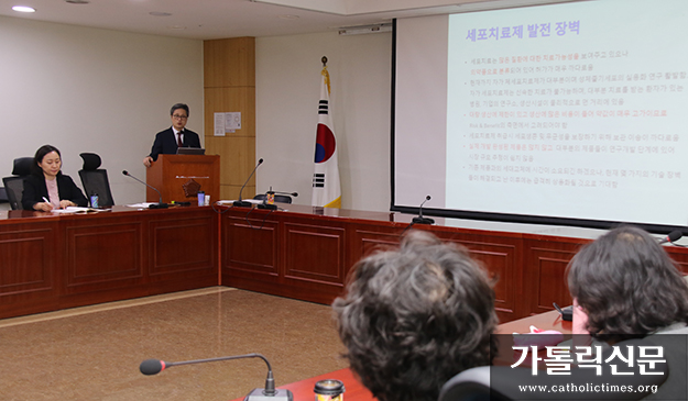 제2기 국회 생명학교가 ‘성체줄기세포 연구 어디까지 왔나’를 주제로 4월 20일 서울 여의도 국회의원회관 제8간담회의실에서 마련됐다. 이날 발제를 맡은 가톨릭세포치료사업단 박경호(루카) 단장은 “줄기세포연구를 더욱 활성화하기 위해서는 관련 규제를 개선해야 한다”고 지적했다.