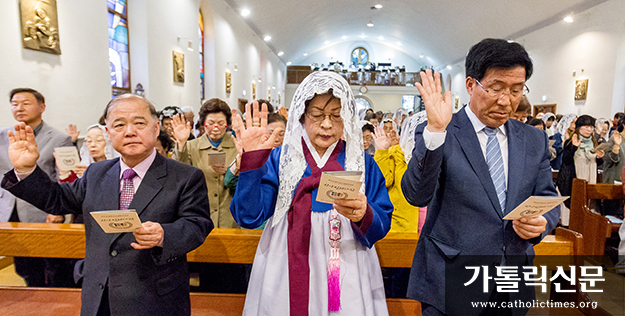 4월 25일 봉헌된 교구 설정 80주년 미사에서 신자들이 ‘신앙 실천 다짐’ 선서문을 발표하고 있다. 사진 박원희 기자