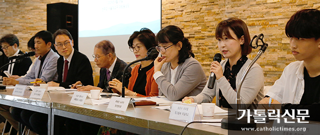 서울 대방동본당 청년협의회 곽혜민 회장(오른쪽에서 두 번째)이 4월 28일 대방동성당 교육관 1층 요셉홀에서 ‘4차 산업혁명과 가난한 사람들, 그리고 교회’를 주제로 열린 최종 토론회 중 발언을 하고 있다.