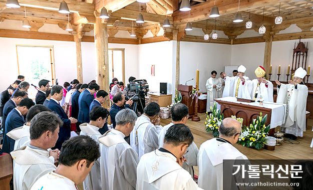 5월 2일 신나무골성지 한옥성당 봉헌식에서 대구대교구장 조환길 대주교와 총대리 장신호 주교, 성 베네딕도회 왜관수도원장 박현동 아빠스가 마침강복을 하고 있다.
