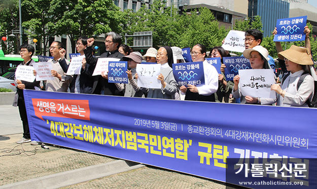 5개 종교 환경단체 연합체인 종교환경회의(상임대표 양기석 신부)는 5월 3일 오전 11시 서울 광화문광장에서 4대강보해체저지범국민연합 규탄 기자회견을 열고 4대강을 살리기 위해 종교계가 더욱 박차를 가하겠다고 밝혔다. 5개 종교 환경단체는 천주교창조보전연대와 기독교환경운동연대·불교환경연대·원불교환경연대·천도교한울연대로, 회견에는 182개 환경단체로 구성된 4대강재자연화시민위원회도 함께 했다.