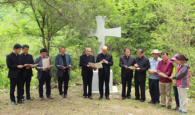 5월 13일 청주교구 내 ‘하느님의 종 이벽 요한 세례자와 동료 132위’ 시복 현장조사 중 재판진이 멍에목성지에서 함께 기도하고 있다. 청주교구 선교사목국 제공
