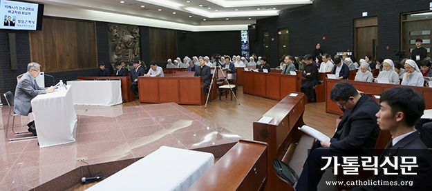 한국순교복자성직수도회가 5월 18일 서울 성북동 본원 복자회관 성당에서 마련한 순교 심포지엄 중 내포교회사연구소 방상근 박사가 발제를 하고 있다.