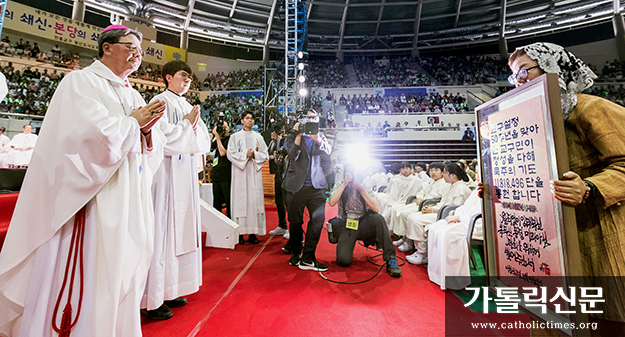 5월 26일 안동체육관에서 봉헌된 안동교구 설정 50주년 감사미사에서 교구민 대표(맨 오른쪽)가 전 교구민이 1년 동안 교구를 위해 바친 묵주기도 1181만8496단 영적예물을 교구장 권혁주 주교(왼쪽 첫 번째)에게 봉헌하고 있다. 사진 박원희 기자