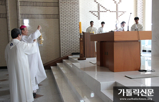 5월 29일 청주교구장 장봉훈 주교가 감곡매괴성모순례지본당 성모광장 지하 경당 축복식 중 제대 분향예절을 거행하고 있다.