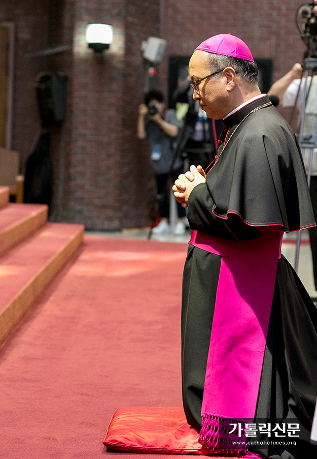 제5대 부산교구장 손삼석 주교가 6월 4일 부산교구 주교좌남천성당에서 거행된 착좌미사에 앞서 성수예식을 하고, 제대 앞 십자가 아래에서 무릎 꿇고 기도하고 있다.
