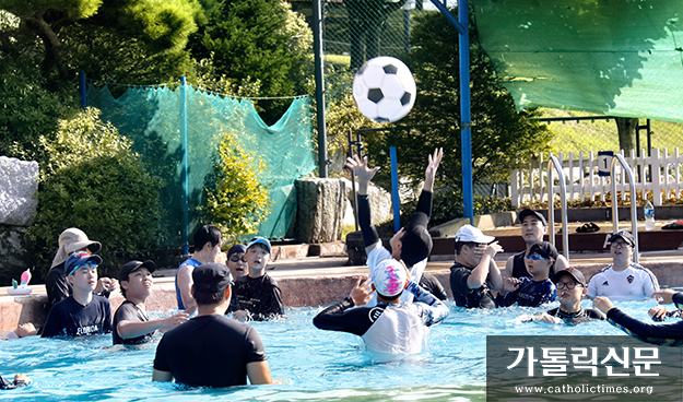 8월 3일 양평 미리내리조트에서 열린 서원동본당 설립 50주년 연합캠프 중 참가자들이 물놀이를 즐기고 있다.