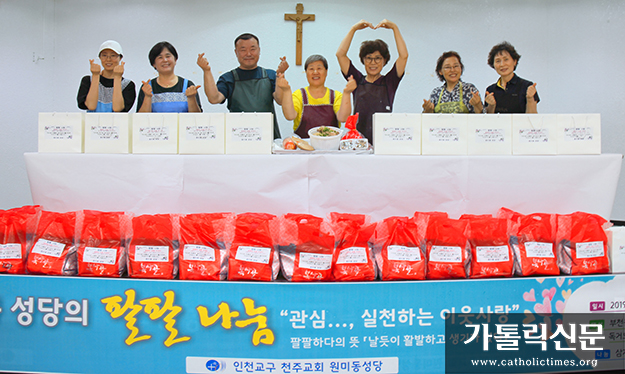 찌는 듯한 무더위로 폭염경보가 발효된 8월 8일, 구수한 삼계탕 냄새가 퍼져 있는 인천교구 부천 원미동본당(주임 김복기 신부) 성당 1층은 줄줄이 늘어선 큼직한 선물 봉투와 봉투를 받아가려는 사람들로 북적였다. 원미동본당이 지역 사회의 어려운 이웃들을 위한 ‘팔팔 나눔’ 행사를 가졌기 때문이다.