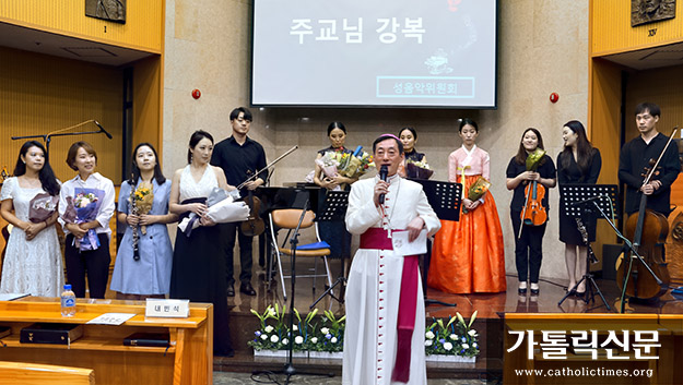 8월 15일 성남 도촌동성베드로성당에서 열린 수원가톨릭유스우니따스 창단 연주회 후 수원교구 교구장대리 문희종 주교가 인사말을 하고 있다.