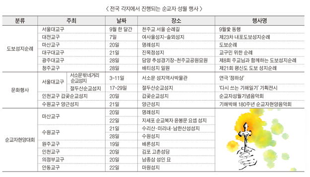 9월 중에는 서울뿐 아니라 많은 교구에서 다양한 순교자성월 행사가 열린다. 특히 이번 순교자성월에는 여러 교구들이 도보성지순례 행사를 마련하고 있어 눈길을 끈다.
