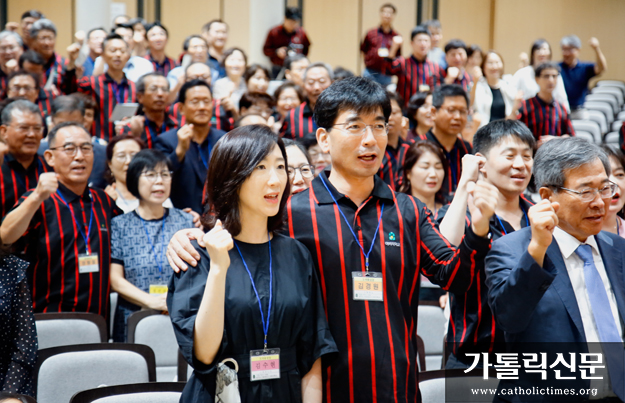 8월 31일 서울 주교좌명동대성당 꼬스트홀 2층에서 열린 서울 아버지학교 설립 10주년 행사에 참가한 부부가 손을 맞잡고 구호를 외치고 있다.