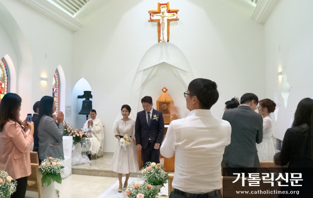하느님의 은총 속에 부부로 새 출발을 하는 신랑과 신부. 혼인미사가 거행되는 이 경당에는 신랑과 신부를 응원하는 박수소리로 가득하다. 15명 남짓한 하객들은 신랑과 신부의 눈을 하나하나 마주치며 진심어린 축하를 건넨다. 24개의 좌석에 독서대, 작은 제대가 전부인 99㎡규모의 경당은 신랑, 신부 가까이에서 격려를 보내기에 안성맞춤이다. 혼잡한 탓에 신랑, 신부에게 인사조차 하기 어려운 여느 결혼식과 달리 차분한 분위기에서 혼인미사에 집중할 수 있다.
