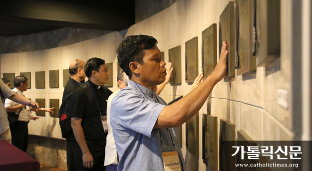 9월 20일 서울 절두산순교성지에서 ‘한국순례주간’에 함께한 아시아 순례자들이 순교자들의 유해함에 손을 대며 기도하고 있다.
