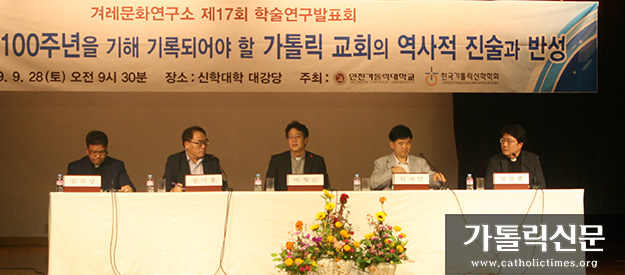 인천가톨릭대학교 겨레문화연구소가 9월 28일 신학대학 대강당에서 마련한 3·1운동 100주년 학술연구발표회 중 발제자들이 종합토론을 하고 있다.