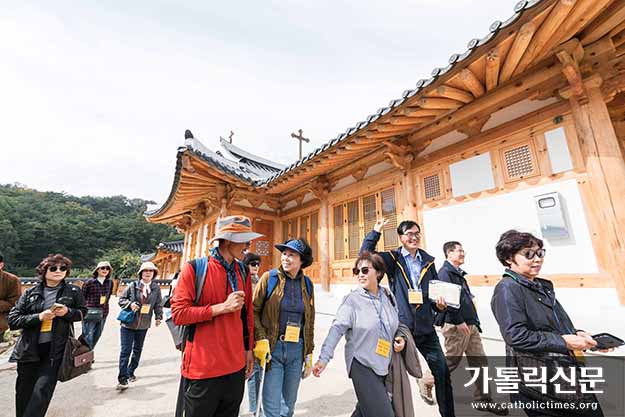 10월 17일 ‘한Ti아고 순례길’ 참가자들이 경북 칠곡 신나무골 성지를 순례하고 있다.