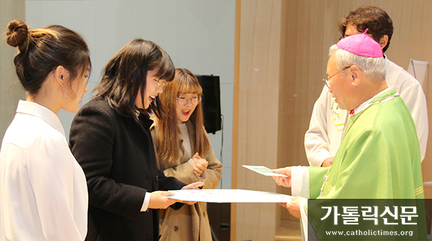 춘천교구 설정 80주년 교리교사 축제 마지막 날인 10월 27일 강원도 춘천 가톨릭회관에서 거행된 누리보듬 축제 찬양 미사 중 교구장 김운회 주교가 ‘청소년 사목 아이디어 및 신앙체험 공모전’ 시상을 하고 있다.