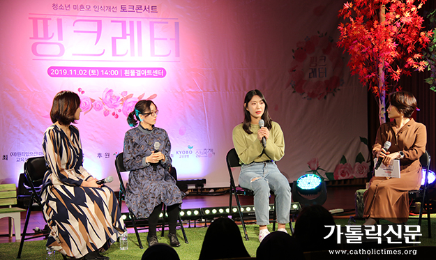 용기 내 생명을 선택하고 책임진 청소년 미혼모들을 위한 인식개선 토크 콘서트 ‘핑크레터’가 11월 2일 오후 2시 서울 서초구 흰물결아트센터 예술극장에서 마련됐다. 청소년 미혼모와 학교 밖 여자 청소년들을 위한 도시형 대안학교 자오나학교(교장 정수경 수녀)가 주최한 이번 콘서트에는 한부모 여성과 그 아이 등 100여 명이 참석했다. 콘서트 제목 ‘핑크레터’는 ‘분홍글씨’라는 뜻으로, 부정적인 낙인을 뜻하는 ‘주홍글씨’에 긍정적인 뜻을 담은 말이다. 청소년 미혼모들에 대한 인식 변화를 긍정적으로 이끌기 위해 붙여진 단어다.