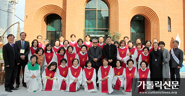 11월 10일 대동본당을 방문한 전민동본당 주임 박진용 신부(가운데 두 사제 중 왼쪽)와 ‘꿈’ 성가대가 대동본당 주임 김선태 신부 등과 함께 새 성당 앞에서 기념사진을 찍고 있다.