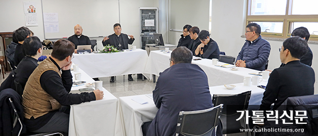 12월 4일 서울 도림동성당에서 정순택 주교와 15영등포-금천지구 소속 사제들이 주일학교 청소년들을 위한 새로운 방법론을 주제로 간담회를 진행하고 있다.