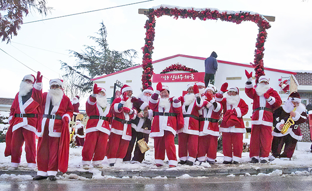 2007년 처음 시작된 이슬촌 성탄 축제는 2016년까지 대규모 축제로 열렸지만, 마을 주민 대부분이 연로해지면서 지난해부터는 소박한 공동체 축제로 지내고 있다. 사진은 마을 주민들이 산타 복장을 하고 기념사진을 찍고 있는 모습. 전남 나주 이슬촌 제공