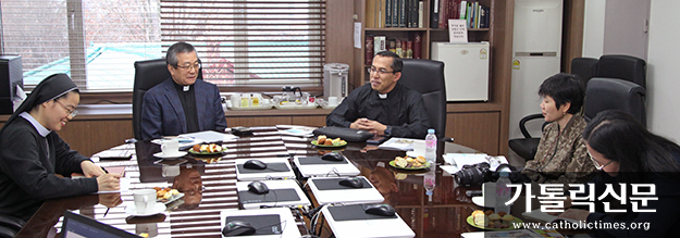 지난해 12월 17일 서울 중곡동 한국천주교중앙협의회 5층 소회의실에서 교황청 전교기구 한국지부장 김준철 신부(왼쪽 두 번째)가 인도네시아지부장 마르쿠스 누르 위디프라노토 신부(김 신부 오른쪽)를 비롯한 인도네시아지부 직원들에게 한국지부의 활동을 설명하고 있다.