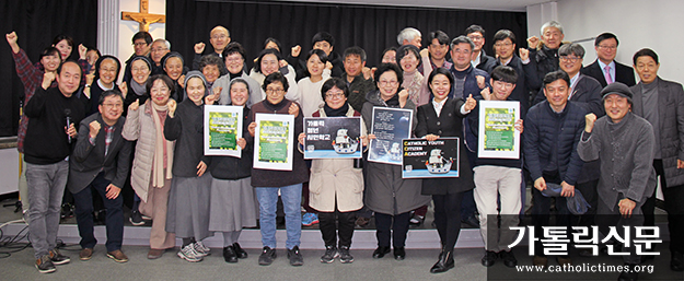 지난해 12월 17일 서울 명동 가톨릭회관에서 열린 가톨릭기후행동 토론회 참석자들이 행사를 마치고 기념사진을 찍고 있다.