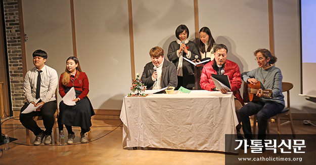 대전교구 천안 목천본당 중고등부 학생들이 12월 20일 충남 천안 가톨릭 천안청소년센터 ‘하품’에서 마련한 북콘서트 중 본당 주임 윤영중 신부와 선교사들이 특별공연을 하고 있다.