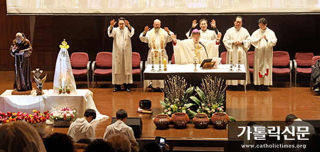 1월 11일 서울 반포동 가톨릭대학교 성의교정 마리아홀에서 열린 ‘사랑이 피는 기도모임’ 설립 20주년 ‘젊은이 성체조배의 밤 대피정’ 중 미사를 주례한 정순택 주교가 사제단과 함께 장엄강복을 주고 있다.