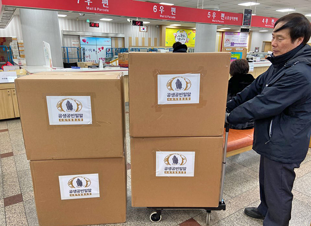 1월 17일 따알 화산 폭발로 고통을 겪고 있는 피해 주민을 위해 공생공빈 밀알 사회적 협동조합이 지원하는 미세먼지 차단 방역 마스크가 항공우편으로 발송되고 있다. 공생공빈 밀알 사회적 협동조합 제공