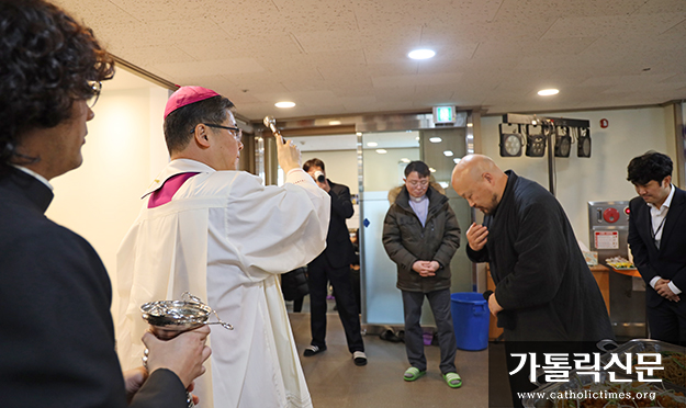 (재)서울가톨릭청소년회 이사장 정순택 주교가 1월 13일 청소년문화공간JU역촌동 축복식에서 새 단장한 공간에 성수를 뿌리고 있다.