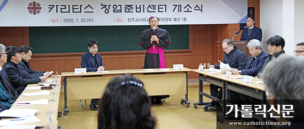 1월 22일 서울대교구 사회사목담당 교구장대리 유경촌 주교가 ‘카리타스 창업준비센터’ 축복식에서 관계자들에게 당부의 말을 전하고 있다.