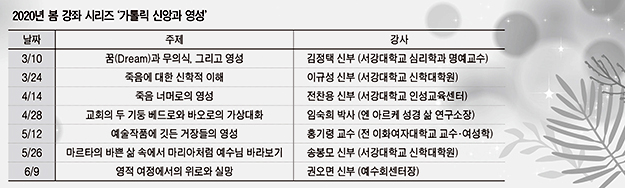예수회센터는 특별히 2020년 봄을 맞아 시리즈 강좌를 운영하고 있다. ‘가톨릭 신앙과 영성’을 주제로 진행되는 이번 교육은 신학, 철학, 성경, 영성, 예술 등 다양한 분야의 강의를 통해 교회의 정신과 영성을 느낄 수 있는 강좌로 마련됐다.
