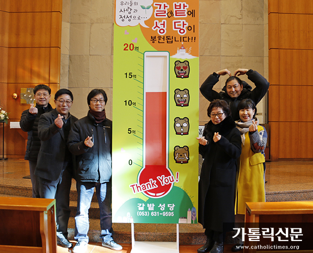 대구 갈밭본당 주임 김해인 신부(앞줄 왼쪽 두 번째)와 신자들이 2월 5일 모본당인 도원본당에 설치된 신축 기금 온도계 앞에서 기념사진을 찍고 있다.