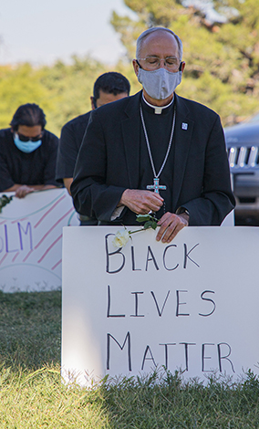 미국 텍사스 엘파소교구 마크 세이츠 주교와 사제들이 6월 1일 파소 기념공원에서 ‘흑인의 목숨도 소중하다’는 메시지와 함께 인종차별을 반대하는 의미로 무릎을 꿇고 있다. CNS