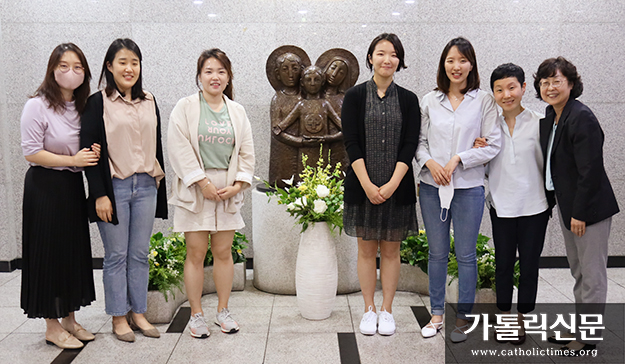 전쟁과 평화에 관한 미국 주교회의 사목서한 「평화의 도전」을 번역한 여성 평신도 연구자들과 감수를 맡은 한국가톨릭여성연구원 박은미 대표가 출간에 앞서 6월 4일 서울 동교동 청년문화공간JU에서 기자 간담회를 갖고 기념촬영을 하고 있다. 김예슬, 양서희, 장은희, 고민정, 박민아, 정승아 연구자와 박은미 대표.(왼쪽부터)