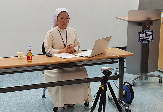 가톨릭대학교 서울성모병원 호스피스완화의료센터 호스피스완화의료팀장 라정란 수녀가 6월 12일 서울 반포동 가톨릭대학교 성의회관에서 ‘호스피스 환자에 대한 돌봄’을 주제로 발표하고 있다. 이번 가톨릭생명윤리연구소 월례 세미나는 온라인으로 실시간 방송됐다. 가톨릭생명윤리연구소 제공
