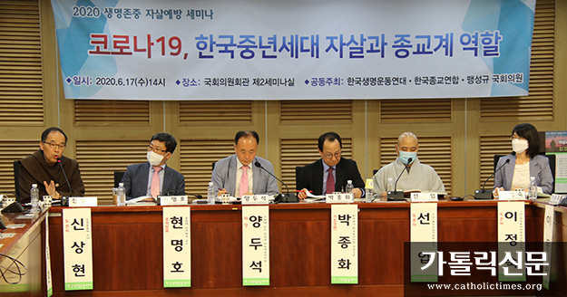 주교회의 가정과생명위원회 등 37개 종교·시민단체 연합체인 한국생명운동연대(공동대표 신상현 수사)와 한국종교연합(공동대표 김홍진 신부), 더불어민주당 맹성규 의원은 이러한 문제의식에 착안해 6월 17일 서울 여의도동 국회의원회관에서 ‘2020 생명존중 국회정책세미나’를 열었다. 참석자들은 ‘코로나19, 한국중년세대 자살과 종교계 역할’을 주제로 논의하면서 ‘종교계’의 자살예방 활동이 특히 중요하다고 입을 모았다.