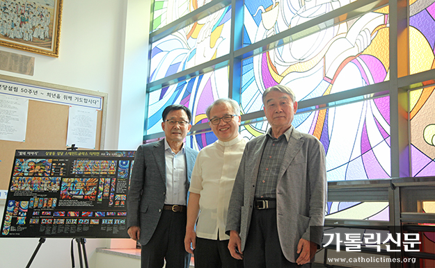6월 18일 서울 상봉동본당 주임 강송수 신부(가운데)와 본당 50주년 준비위원회 홍대선 위원장(오른쪽), 조용만 간사가 성전 스테인드글라스와 설명판 앞에서 기념사진을 찍고 있다.