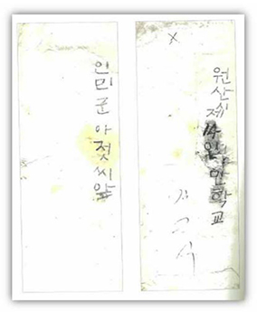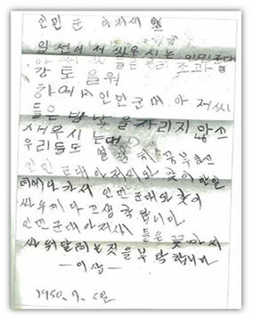 일선에서 싸우시는 인민군대 아저씨들은 우리 조과(조국과?) 강토을 워하여서 인민군대 아저씨들은 밤낯을 가리지 않고 새우시는대 우리들도 열심히 공부하고 인민군대 아저씨와 같이 한일터에 나가서 인민군대와 같이 싸우게다고 생각합니다 인민군대 아저씨들은 끝까지 싸워달려는 것을 부탁합니다 –이상-”