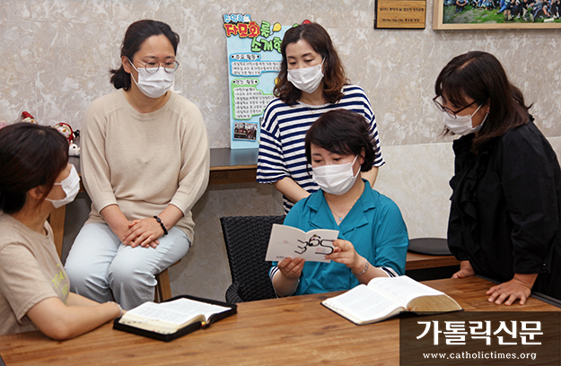 서울 신정3동본당 김혜경(오른쪽 두번째) 여성총구역장과 신자들이 7월 10일 오전10시 미사 후 ‘365일 성경읽기’에 맞춰 각자 읽은 성경 구절에 대해 나눔을 하고 있다.