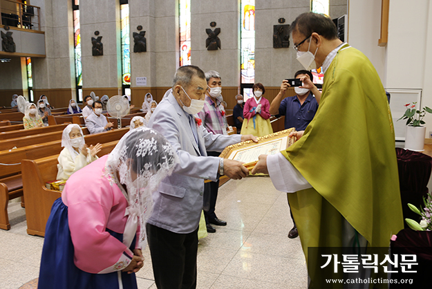 7월 19일 수원 고색동본당 설립 50주년 기념일 행사에서 혼인 성사 50주년 이상 부부에게 혼인 갱신 축복장이 전달되고 있다.