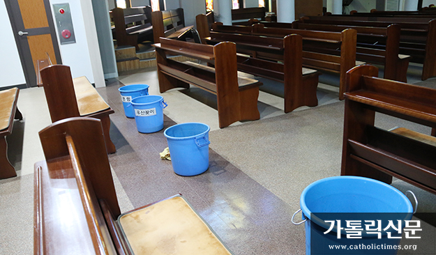 수원교구 용인 백암본당이 긴 장마로 발생한 천장 누수로 물받이를 놓았다.