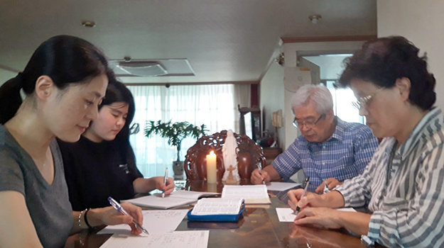 수원교구 분당야탑동본당 중학교 1학년 박서진(왼쪽 두 번째)양이 가족들과 함께 신앙북 프로그램을 나누고 있다. 분당야탑동본당 제공