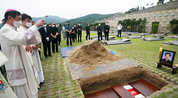 9월 5일 안성추모공원 내 성직자 묘역에서 문희종 주교 주례로 무덤 축복식 및 하관 예식이 거행되고 있다. 수원교구 홍보국 제공